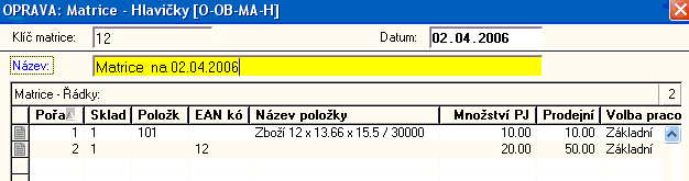 formuláře pro editaci. Pro zadaný klíč a název matrice zapisujeme do řádků skladové položky, ze