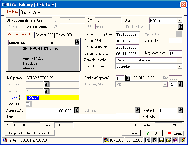 Tlačítko "Opravit" zobrazí dialog pro editaci faktury:
