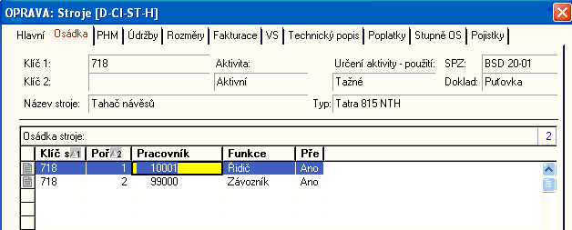V horní části zobrazuje základní údaje o stroji, v dolní části prohlížeč osob z číselníku Pracovníci,