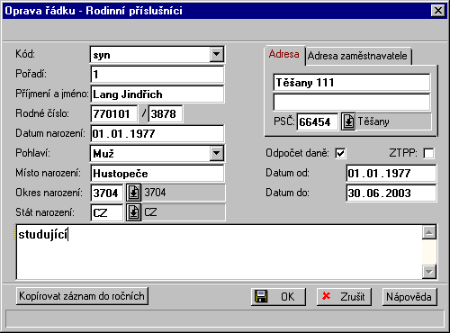 - Adresa a Adresa zaměstnavatele: dvě záložky - odkazy na adresář