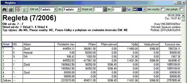 pohybu, součty za sklad pak nemusí odpovídat stavu skladu celkem.